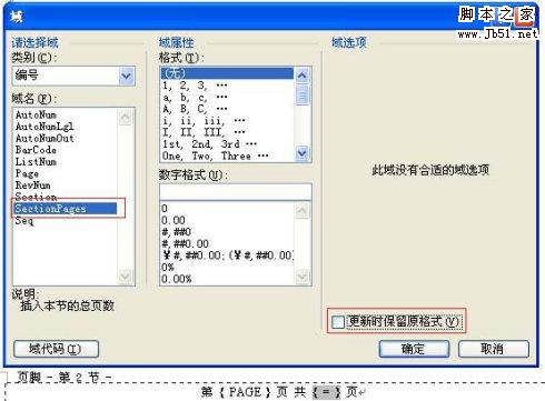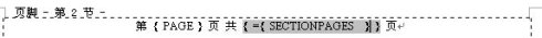 插入后域代码变为“第{PAGE}页 共{ ={SECTIONPAGES} } 页”。这样总页数的问题就解决了。