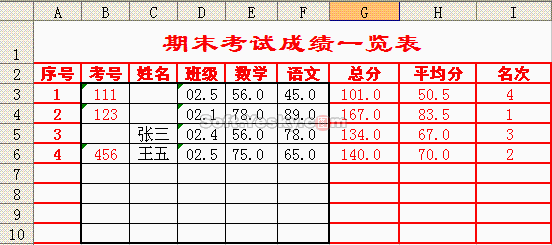 因为考号可能较长、班级前面可能带“0”,为防止Excel把它们进行科学计数处理或省略“0”,所以将它们的数字格式设为“文本”;将“数学”、“语文”、“总分”、“平均分”相关区域设为“数值”,保留一位小数。