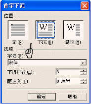 (2)在“位置”栏下,选中“下沉”样式,接着在“选项”下对下沉文字进行“字体”、“下沉行数”、“距正文”等设置,如图2-6所示。
