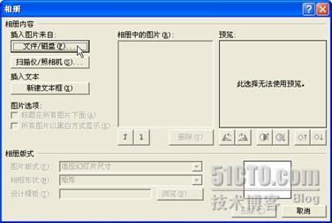 首先启动PowerPoint,执行“插入”菜单下的“图片”→“新建相册”命令,打开“相册”对话框。我们首先要选择相片的来源,由于我们事先已经将相片存入电脑中,所以在此单击“文件/磁盘”按钮。