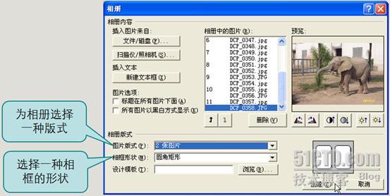 执行“格式”菜单下的“相册”命令,即可打开“设置相册格式”对话框。完成了相册的编辑操作后,别忘了单击“更新”按钮,保存你的设置!