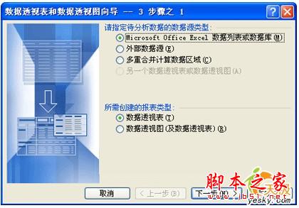 在“数据透视表和数据透视图向导 - 3 步骤之 1”的“请指定待分析数据的数据源类型:”下,单击“Microsoft Office Excel 列表或数据库”。 在“所需创建的报表类型:”下,单击“数据透视表”。 单击“完成”。