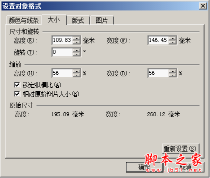 依次选择“设置对象格式”→“大小”→“重新设置”,输入缩放百分比,或修改“高度”,即可自由缩放图片。