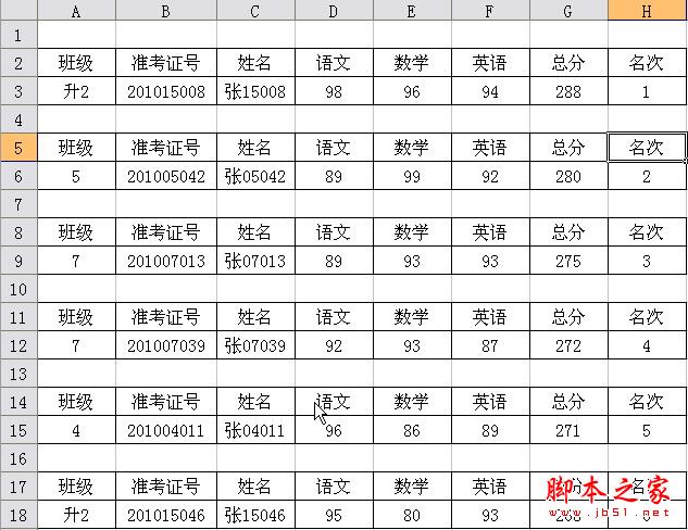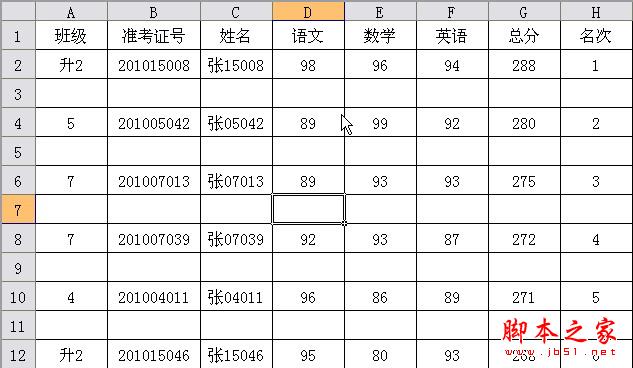 可以看到,仍有相邻的两行成绩。所以,还需要再次插入空行。