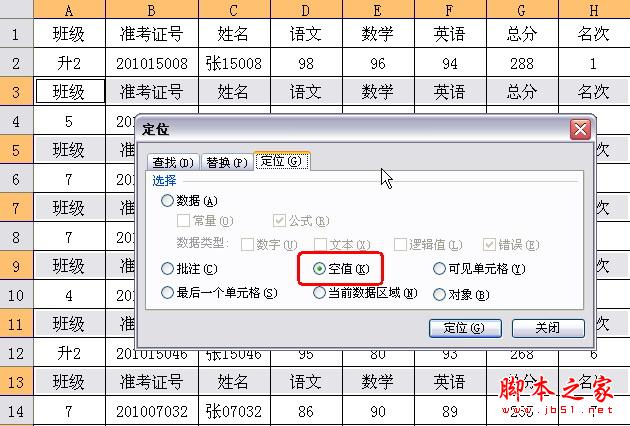 选中A:H列单元格,按“Ctrl+G”快捷键打开“定位”对话框。选中“空值”单选项,然后点击“定位”按钮选中成绩表中的空格(如果成绩表中原有空格,应该先填入内容)。在编辑栏中输入公式“=A$1”,然后按下“Ctrl+Enter”组合键,如图7所示,该有的标题就都有了。