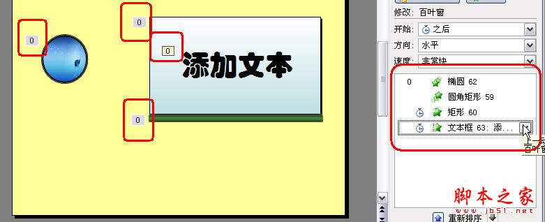 制作两个圆形按钮,原始按钮在下,后续显示按钮与其完全重叠。制作深绿色边框、矩形框。添加文本框,输入文本(不要在矩形上直接添加文件)。这些都做好之后,我们来为它们依次添加动画。