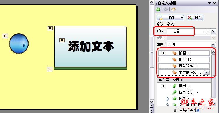 选中后续的圆形按钮,点击右键,在弹出的菜单中点击“自定义动画”命令。然后在右侧的“自定义动画”窗格中“添加效果→进入→其它效果”命令,在打开的“添加进入效果”对话框中选择“渐变”效果。完成后,点击右侧任务窗格动画列表中的动画任务,在上方“开始”下拉列表中点击“之前”,另外还可以将 “速度”下拉列表选择为“非常快”,如图3所示。
