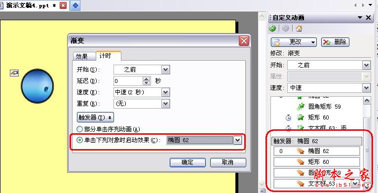 二、指定显示触发器 按住“Shift”键,分别选中任务窗格动画列表最上方和最下方的动画任务,将所有四个动画任务全部选中,然后点击右侧的下拉按钮,在弹出的菜单中点击“效果选项”命令,打开“效果选项”对话框。点击“计时”选项卡,点击下方“触发器”按钮,选中“单击下列对象时启动效果”单选项,并在右侧列表中选中原始的圆形按钮,如图5所示。