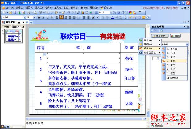 3、在矩形上单击鼠标右键,在弹出菜单里单击“自定义动画”命令,依次单击“自定义动画”窗格里的“添加效果/退出/渐变”命令(如图3)。
