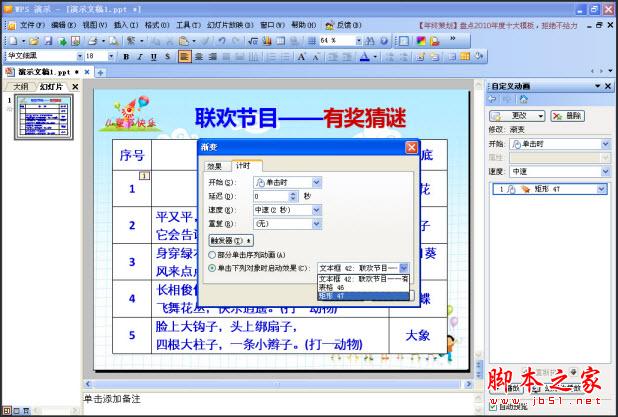 4、双击右侧窗格里的动画选项,在弹出的“渐变”对话框里,先单击顶部的“计时”标签,再单击“触发器”按钮,选中“单击下列对象时启动效果”单选项后,单击右侧的下拉箭头,将该矩形设为自身动画的触发器(如图4)。