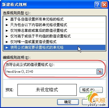 在打开的“新建格式规则”对话框中,点击“选择规则类型”列表中“使用公式确定要设置格式的单元格”,然后在下方的“为符合此公式的值设置格式”输入框中输入公式“=mod(row(),2)=0”,如图5所示。其用意是指定行号是偶数的单元格为要设置格式的单元格。