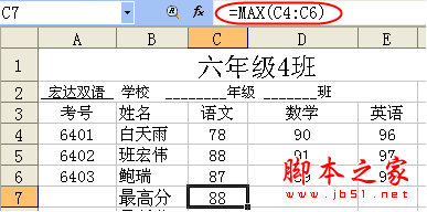 在C7中输入=max(c4:c6),那么C7中的值为C4:C6中的最大值。见图5-3-6所示。
