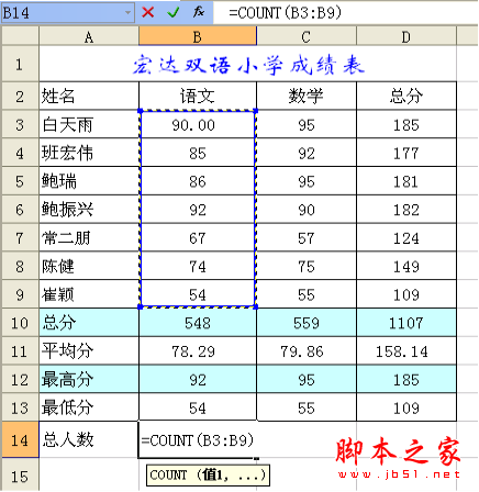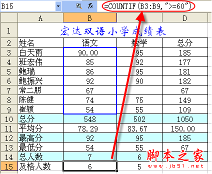 图5-3-10中统计了及格人数,range是 B3:B9 , criteria是">=60" 。