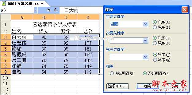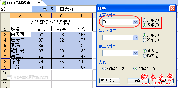 在主要关键字的右边有 升序 与 降序 ,由于我们是按分数从高到低排列的,因此这儿应当选择 降序。