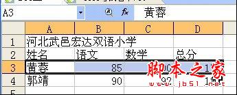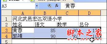 如图2-1-3所示,如果要选择A3到D3,即A3:D3,那么将鼠标在A3格中点击一下,然后按下鼠标左键,向D3格中移动,那么A3:D3将被选中,效果如图2-2-1所示。