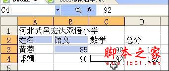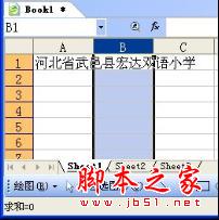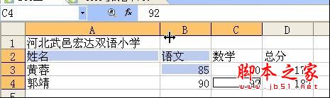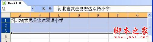 如图2-2-6所示,A1单元格中的“河北省武邑县宏达双语小学”这几个字在A1格中是容纳不下的,它已经挤到C1格中去了,此时我们需要调整一下A列的列宽。