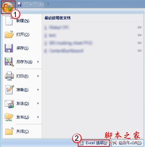 在 Excel 2007 中,按一下左上角的 Office 按钮,然后单击“Excel 选项”。