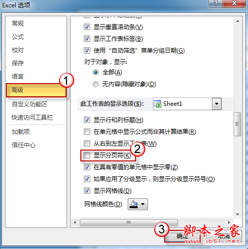 在“选项”窗口左侧单击“高级”,然后从右侧窗口中找到“显示分页符”复选框,清除复选框前的勾选。