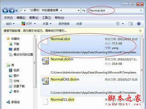 方法一:双击打开“计算机”在右上方的搜索框中输入“Normal.dot”,此时Win7系统会自动搜寻名称包含“Normal.dot”这个名称的文件,搜索的结果可能有很多相似的文件,但你只需要找到“C:UsersAdministratorAppDataRoamingMicrosoft Templates”这个路径下面的“Normal.dot”这个文件,然后将其删除即可。