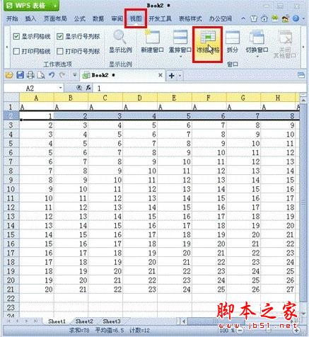 在WPS表格上方的工具栏里找到“视图”的选项卡点击,在“视图”的选项卡里选择“冻结窗格”的按钮。如图2所示。
