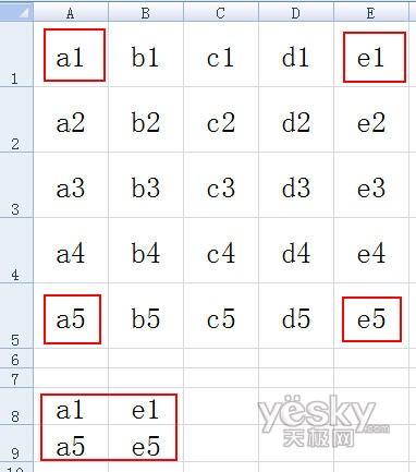 如图2所示,按Ctrl键后同时选中a1、e1、a5、e5四个单元格,复制后粘贴会发现复制的内容连接到了一起。这样可以达到快速复制不连接单元格的作用。当然如果中间有空白单元格则是无法选中的。