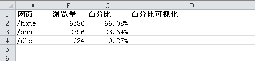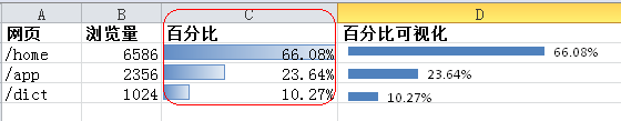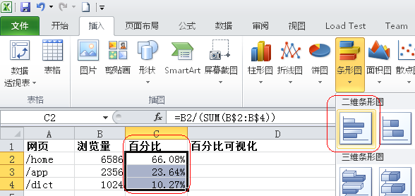 首先选择好百分比这一列,然后插入->条状图->水平条状图