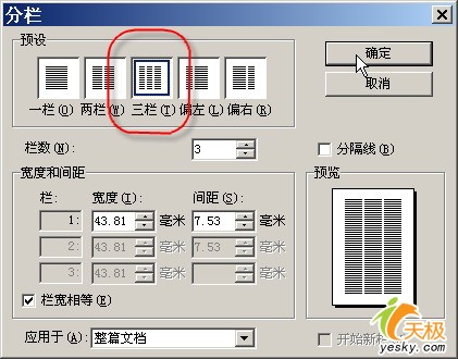 首先选中金山表格中的所有数据,按下“Ctrl+C”键进行复制。然后打开金山文字,新建一个文件,点击菜单命令“格式→分栏”,在打开的“分栏”对话框中设置分三栏,如图3所示。
