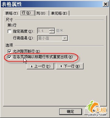 按下“Ctrl+V”快捷键,可以看到,粘贴过来的表格已经自动分成三栏显示了。美中不足的是后面的两栏没有标题行。不过,加上标题行并不难。选中第一栏中的标题行,点击右键,在弹出的快捷菜单中选择“表格属性”命令,打开“表格属性”对话框。点击“行”选项卡,选中“在各页顶端以标题行形式重复出现”复选项,如图4所示。确定后,每栏的表格就会自动添加这个标题行了。