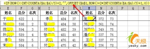 后移一列,从M2单元格开始第三栏。M2单元格的公式为“=IF(ROW()> INT(COUNTA($A:$A)/3)+2,"",OFFSET($A$1,ROW()+2*INT(COUNTA($A:$A) /3)+1,0))”。然后象前两栏一样修改公式和复制公式。