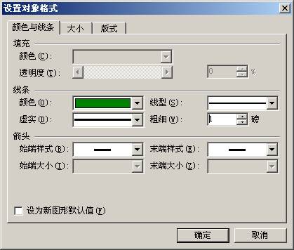现在,我们看到带有网格的页面已经比较符合我们对信笺的要求了,但是由于网格只是辅助显示的,虽然我们设置了网格,但实际打印出来的文档仍然只是“白纸黑字”,并不会显示这些“辅助线”。我们没有办法让这些“网格”打印出来,但却可以制作一些与网格相一致的直线。点击“绘图”工具栏上的“直线” 按钮,照着第一条网格线的位置画一条直线,双击此直线,弹出“设置对象格式”对话框(图2-84)。