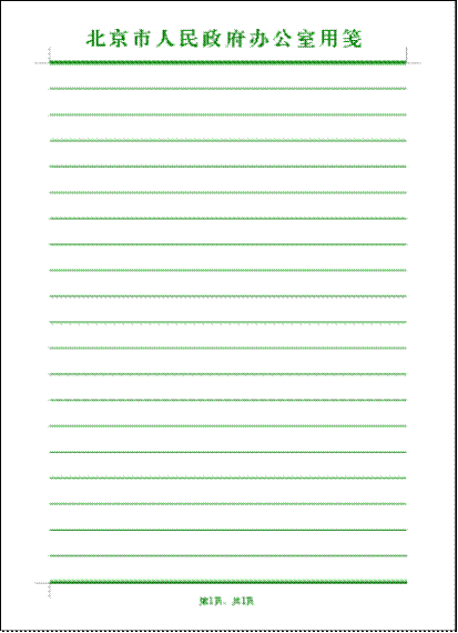 在“视图”菜单中再次进入“页眉页脚”编辑模式,在页眉中输入诸如“北京市人民政府办公室用笺”样的个性标题,然后切换到页脚,并在其中输入 “第页,共页”字样,并分别把光标定位在“第页”和“共页”之间,从“页眉和页脚”工具栏中点击输入“插入页码”和“插入页数”按钮。如果喜欢,你还可以将横线、页眉标题和页号信息的颜色设置为绿色、红色或其他你喜欢的颜色,甚至可以插入漂亮的图片做水印,使你的信笺模板个性十足(图2-86)。