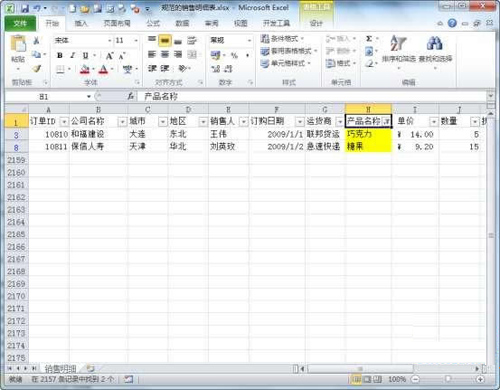 2、单击“产品名称”列上的筛选按钮,选择“按颜色筛选”,并挑选颜色,例如“黄色”。