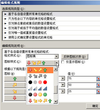 如果要通过“编辑格式规则”对话框来修改图标集条件格式,可以看到在该对话框中选择图标集样式时,Excel 2010直观地显示了各种样式,而不是Excel 2007中的图标样式名称。
