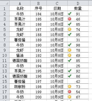 图中先对D列设置了“四色交通灯”图标样式,然后对较大的一些数值设置了另一种图标样式“绿色复选符号”,而对于较小的一些数值,则隐藏了单元格中的图标,这样看起来更加醒目一些。