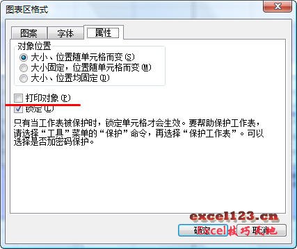 如果要只打印工作表中的数据,而不打印图表,可以选择图表,然后单击菜单“格式→图表区”,弹出“图表区格式”对话框,选择“属性”选项卡,取消选择“打印对象”。