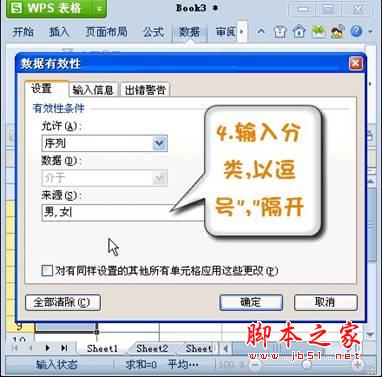 设定数据有效性的来源有两种方法。一种我们可以直接在框内输入数据的分类,如“男,女”要注意的是不同的类别中间要用逗号隔开。然后点击确认按钮即可。如图4所示。