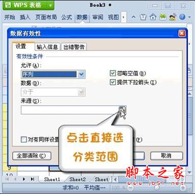 接下来我们对数据的有效性条件进行设置,在对话框中选择“设置”的选项卡,在选项卡中的打开“允许”下方的下拉式菜单,选择序列。如图3