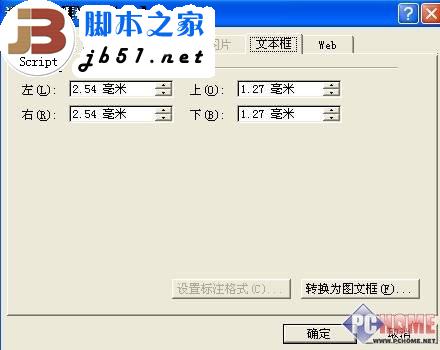 5. 选中文本框,执行“格式→文本框”命令,打开“设置文本框格式”对话框(如图2),在“文本框”标签中按“转换为图文框”按钮(此步关键),在随后弹出的对话框中直接按“确定”按钮。