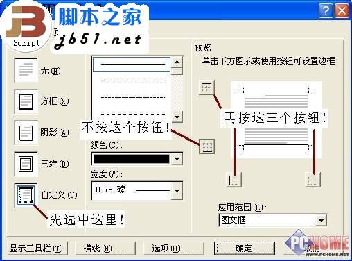6. 再次选中文本框(此时应该是图文框了),执行“格式→边框和底纹”命令,打开“边框和底纹”对话框(如图3),在“边框”标签中,先选中“设置”下面的“自定义”选项,再按预览区域中的三个边框设置按钮各一次(只保留一个不按,如图3),“确定”退出。