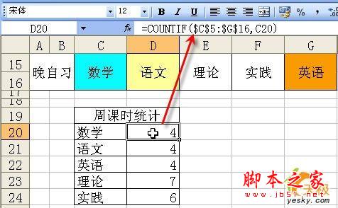 比如我们要统计图2所示课程表中各学科的课时数,那么我们只需在C20单元格输入“数学”,然后在C21、C22、C23、C24分别输入其它的四门学科名称,然后在D20单元格输入公式“=COUNTIF($C$5:$G$16,C20)”,然后回车,就可以统计出在C5: G16单元格中数学出现的次数了,如图5所示。拖动填充句柄向下就可以得到其它几门课的课时数统计。