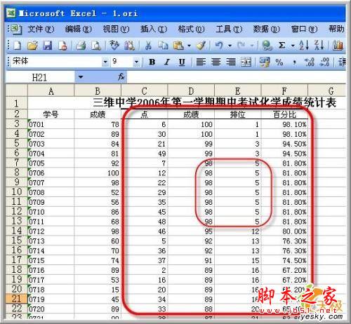 可以看到,此时生成一个四列的新表格,其中“点”是指排序后原数据的序数,在本实例中对应与学号,这也是很实用的一个序列;“成绩”即为排序后的数据系列;“排位”采取重复数据占用同一位置的统计方法;“百分比”是按照降序排列的,为了得到真正的“百分比排位”,还需要稍微作一下调整。