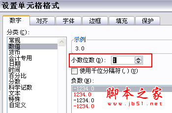 设置单元格格式 对话框可以让你显示小数点 。 在 数值 类别里, 你有看到 小数数位 的设定吗 ? 如果你选取 "1" ,这样就会显示1位数的小数点,如 "3.0"。