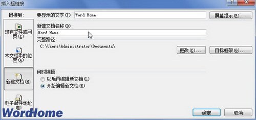 第2步,打开“插入超链接”对话框,在“链接到”区域选中“新建文档”选项。在“新建文档名称”编辑框中输入新文档的名称,然后单击“完整路径”区域的“更改”按钮选择新文档的保存位置。在“何时编辑”区域,选中“开始编辑新文档”单选框将在完成创建超链接后打开新文档,选中“以后再编辑新文档”单选框将只创建超链接而不打开新文档。设置完成单击“确定”按钮即可,如图2所示。