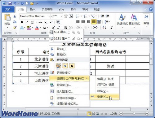 方式2:打开Word2010文档窗口,右键单击链接对象。在打开的快捷菜单中指向“链接的…对象”级联菜单,并在打开的下一级菜单中选择“链接”命令,如图2所示。