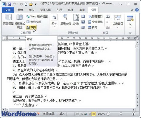 5.草稿视图 “草稿视图”取消了页面边距、分栏、页眉页脚和图片等元素,仅显示标题和正文,是最节省计算机系统硬件资源的视图方式。当然现在计算机系统的硬件配置都比较高,基本上不存在由于硬件配置偏低而使Word2010运行遇到障碍的问题,如图2009120205所示。