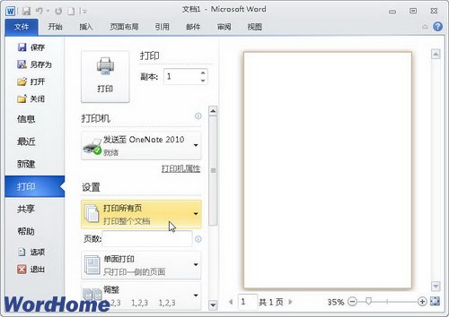 打开“打印”命令面板,在该面板中可以详细设置多种打印参数,例如双面打印、指定打印页等参数,从而有效控制Word2010文档的打印结果,如图5所示。
