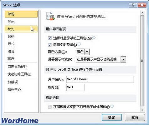选择“文件”面板中的“选项”命令,可以打开“Word选项”对话框。在“Word选项”对话框中可以开启或关闭Word2010中的许多功能或设置参数,如图7所示。