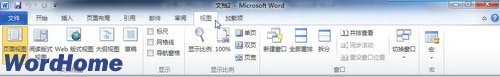 7.“视图”功能区 “视图”功能区包括文档视图、显示、显示比例、窗口和宏几个组,主要用于帮助用户设置Word2010操作窗口的视图类型,以方便操作,如图7所示。