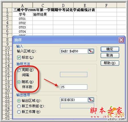 2. 选择“工具”—“数据分析”—“抽样”后,出现对话框,依次选择: