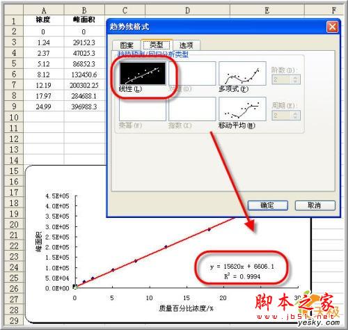 在选项卡中显然详细多了,注意选择X、Y对应的数据列。“常数为零”就是指明该模型是严格的正比例模型,本例确实是这样,因为在浓度为零时相应峰面积肯定为零。先前得出的回归方程虽然拟合程度相当高,但是在x=0时,仍然有对应的数值,这显然是一个可笑的结论。所以我们选择“常数为零”。